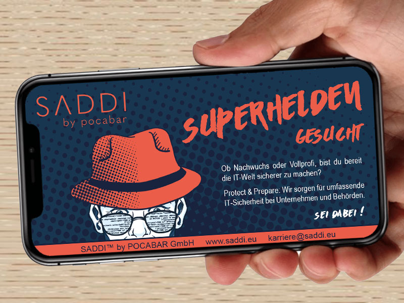As reference to SADDI's comic book style, the ad targets potential "super heroes for making the IT world a safer place". It doesn't show open positions and addresses beginners as well as pros, to draw public attention to exciting jobs in this field, and to make people curious to learn more now.